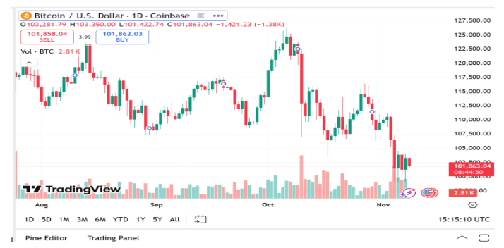 At the time of writing, Bitcoin is trading at $101,281.79, up 1% over the last 24 hours. It has a market capitalization of $2.03 trillion, with $73.25 billion in trading volume, down 12.49% as smaller traders retreat.